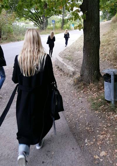 6. Tiga cewek berambut pirang dengan baju hitam sedang di jalan yang sama.